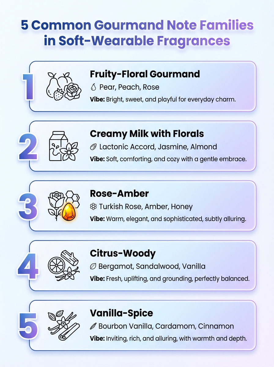 This infographic breaks down the five gourmand note families in soft-wearable fragrances. It shows how mouthwatering gourmands and soft wearable gourmands blend to form wearable scent profiles.