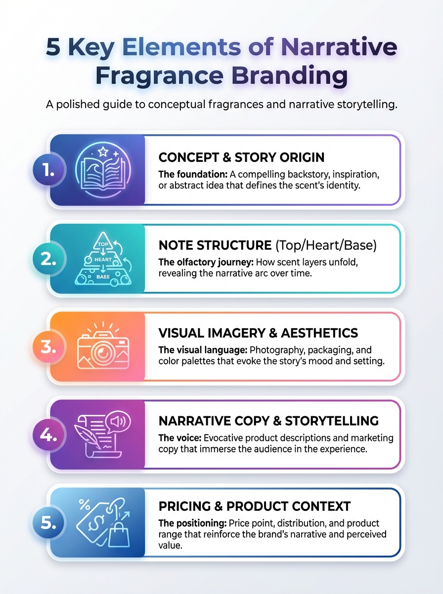 A visual guide to how narrative storytelling informs conceptual fragrances. Discover the five key elements that shape a cohesive fragrance branding narrative.