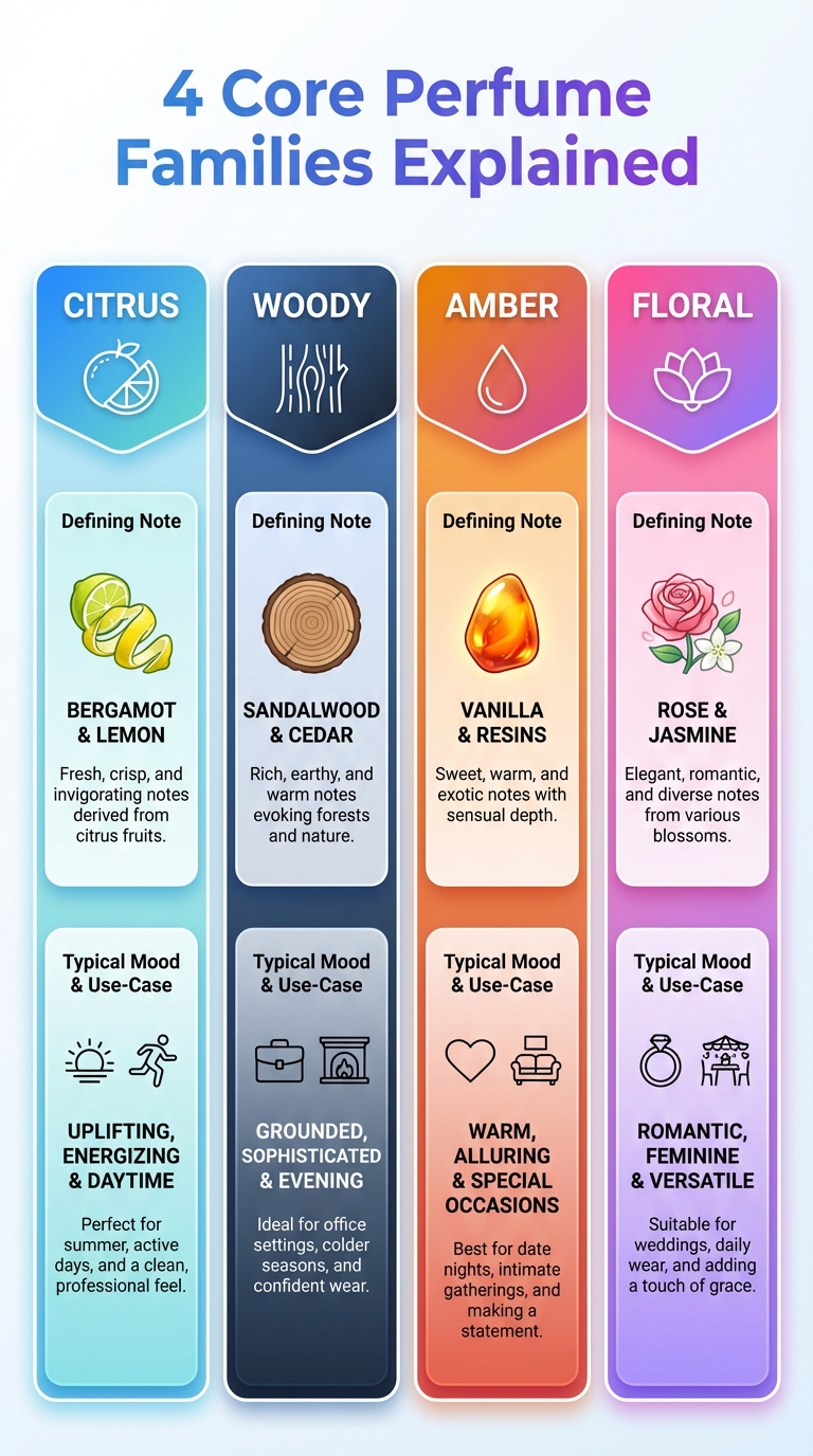 Infographic illustrating the 4 core perfume families with key notes and examples.