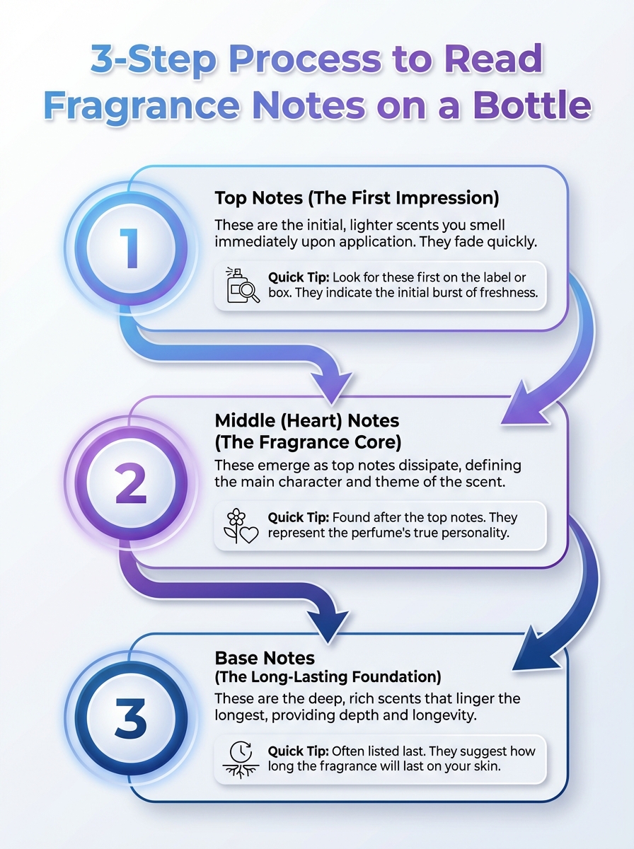 A quick, visual guide to decoding fragrance notes on the bottle. Learn the three steps to identify top, middle, and base notes at a glance.