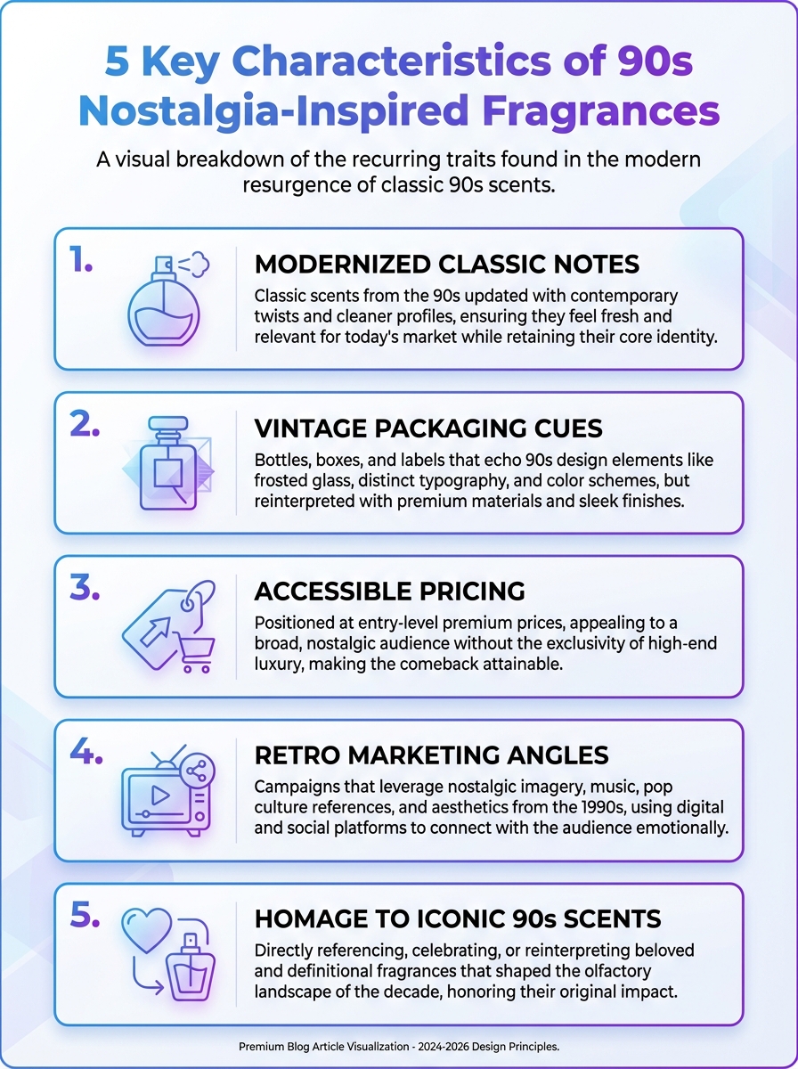 Infographic: 5 key characteristics of 90s perfume comeback and nostalgia-driven reissues.